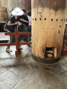 ↓有名な「柱の穴くぐり」。穴のサイズは30センチ×37センチで、大仏様の鼻の穴と同じ大きさと言われています。