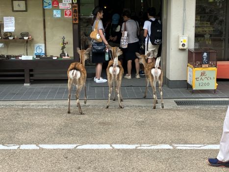 鹿せんべいを売っているお店の前にいれば効率良くせんべいにありつけると分かっているのですね(^▽^;)